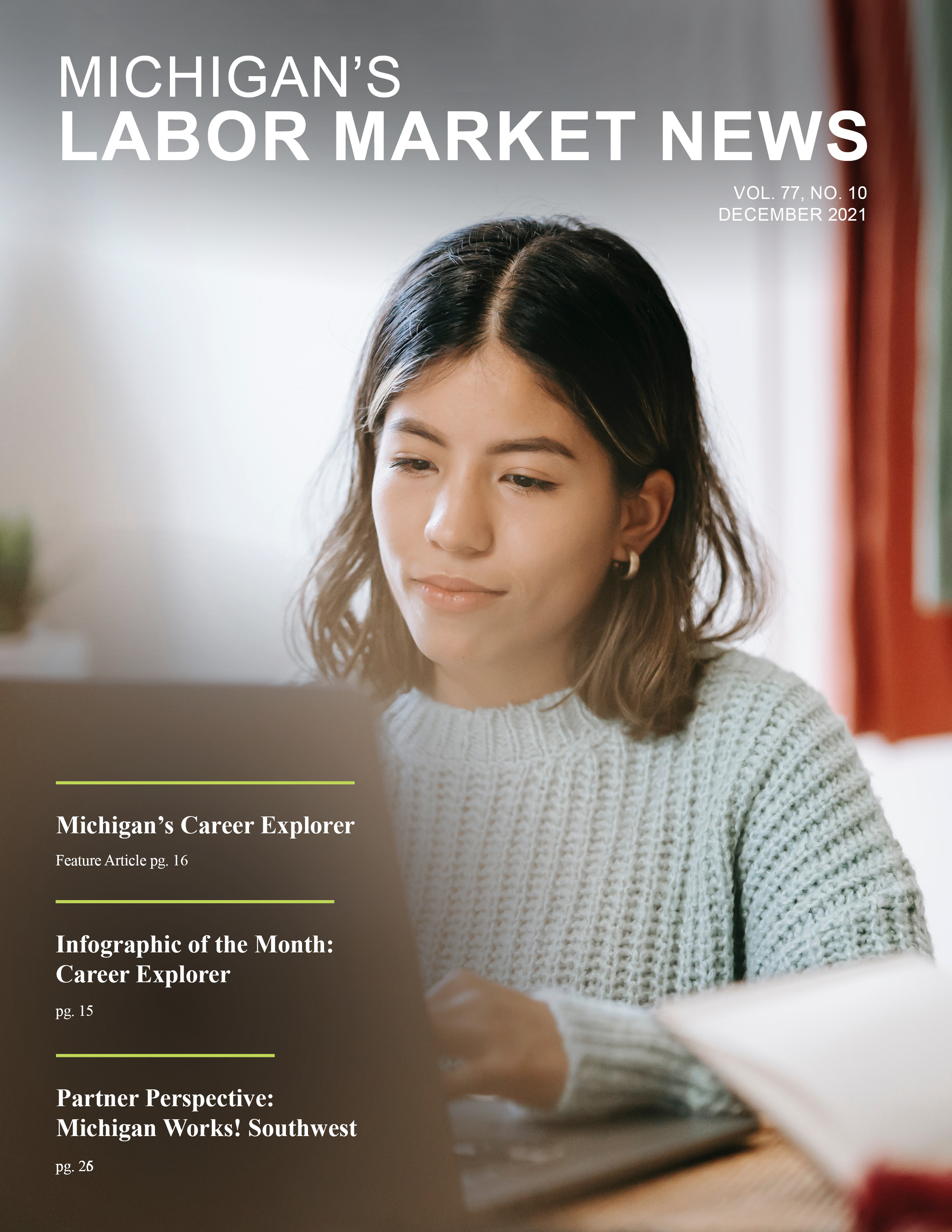 December 2021This month's issue features an article on Michigan's Career Explorer tool, an Infographic of the Month that displays Career Explorer's inputs and uses, and a Partner Perspective from Michigan Works! Southwest.