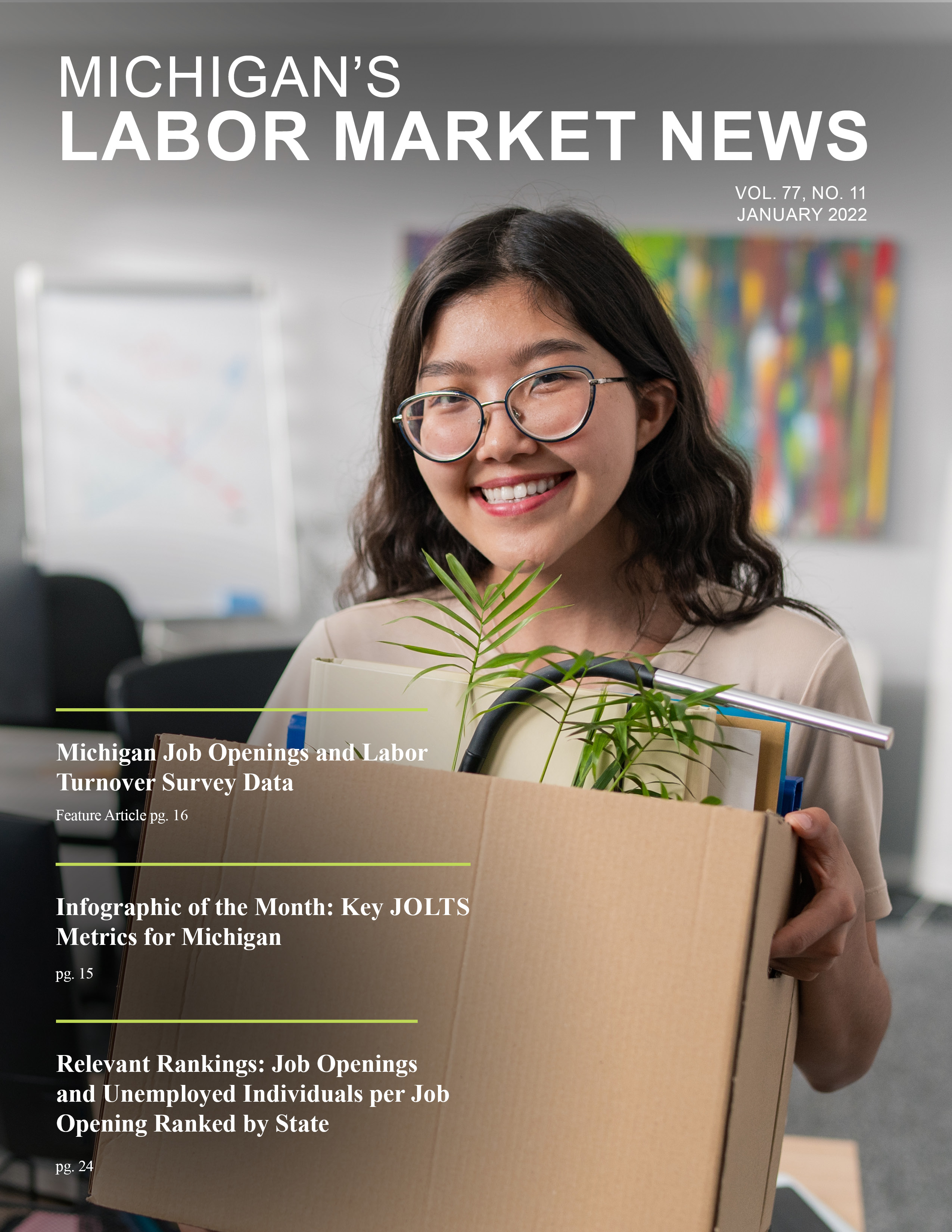 January 2022This month's issue features an article on Michigan Job Openings and Labor Turnover Survey data, an Infographic of the Month that displays a snapshot of how different JOLTS metrics are performing in Michigan, and Relevant Rankings that feature job openings and unemployed individuals per job opening ranked by state.