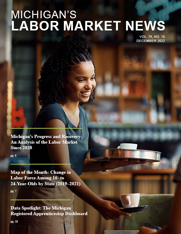 December 2022This month's issue features an update on Michigan's labor market progress and recovery since 2020, an overview of the Michigan Registered Apprenticeship Dashboard, and statewide labor force, industry, and job demand information.