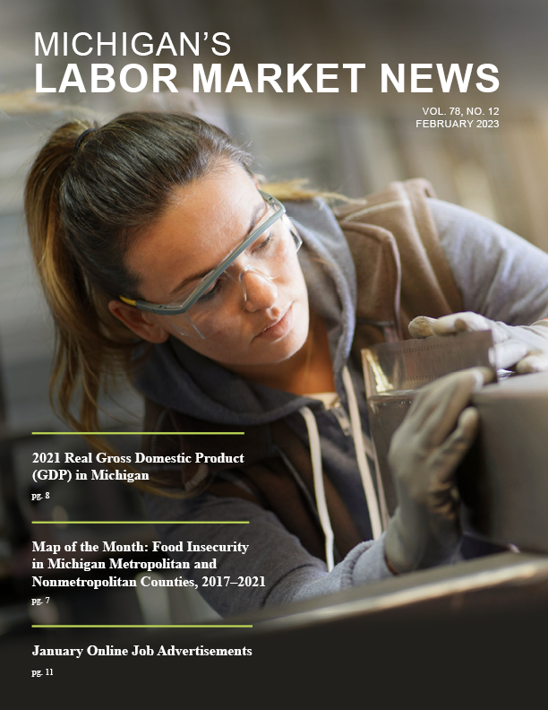 February 2023This month's issue features an article on Michigan's real Gross Domestic Product (GDP) in 2021, a map displaying food insecurity in Michigan metropolitan and nonmetropolitan counties, and an update on the latest job demand data for the state.