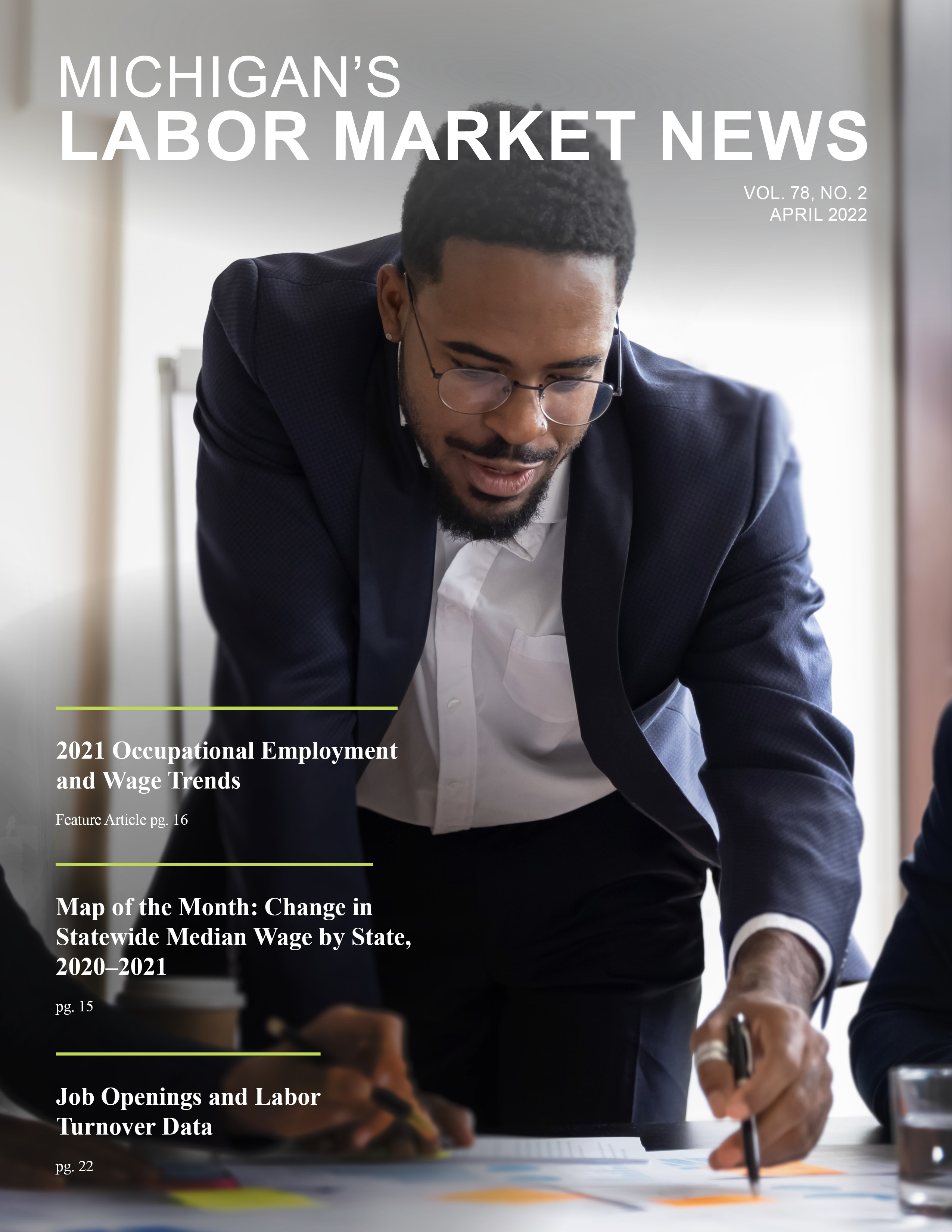 April 2021This month's issue features an article on Michigan’s 2020 Occupational Employment and Wage Trends; an Infographic of the Month illustrating the Four Largest Major Group Changes by Occupational Employment, 2020; and an Ask the Economist that answers the question: “What effect did the pandemic have on occupational employment and wage data in 2020?”