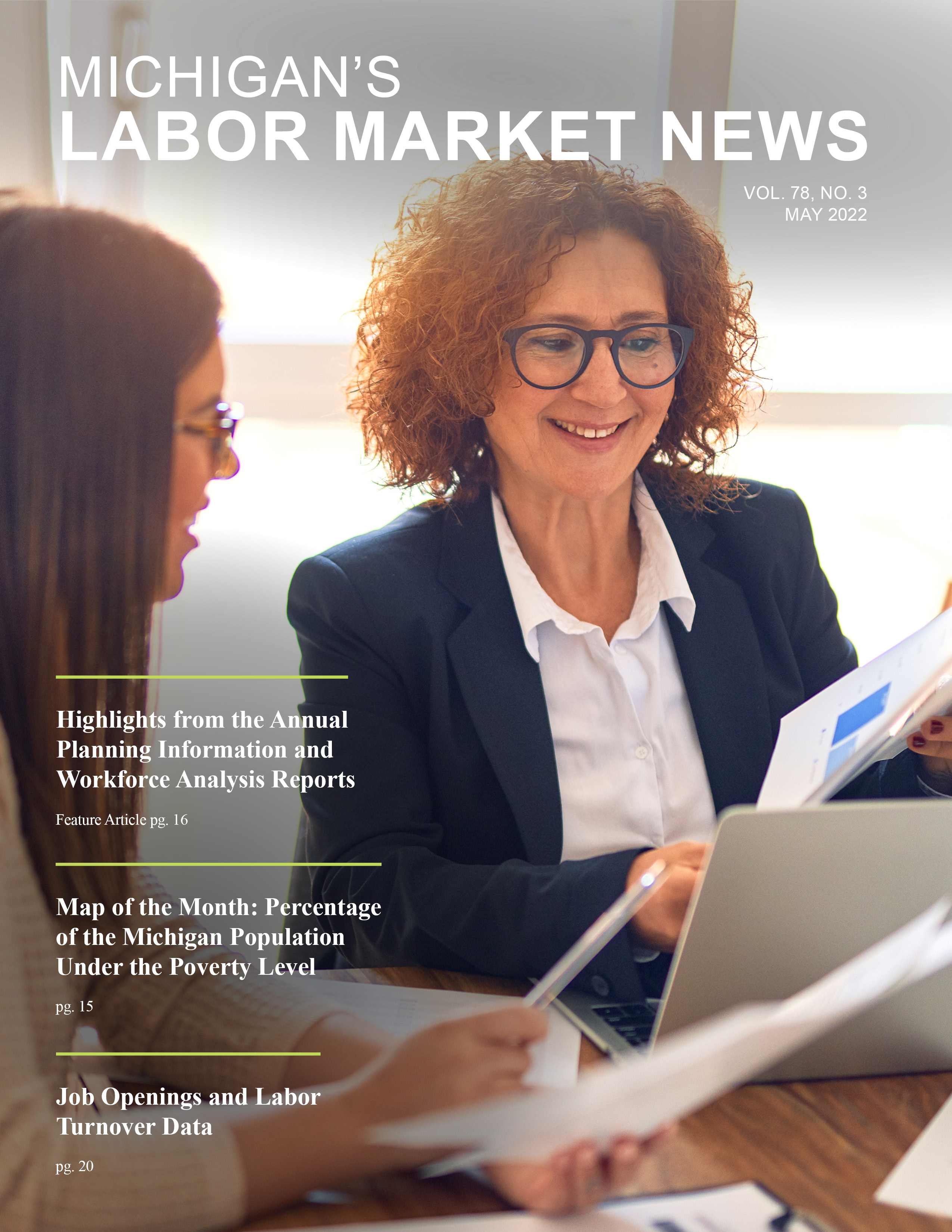 May 2022This month's issue features an article on the Annual Planning and Information and Workforce Analysis Reports, a Map of the Month that illustrates the percentage of the Michigan population under the poverty level, and an article that highlights the latest Job Openings and Labor Turnover data.