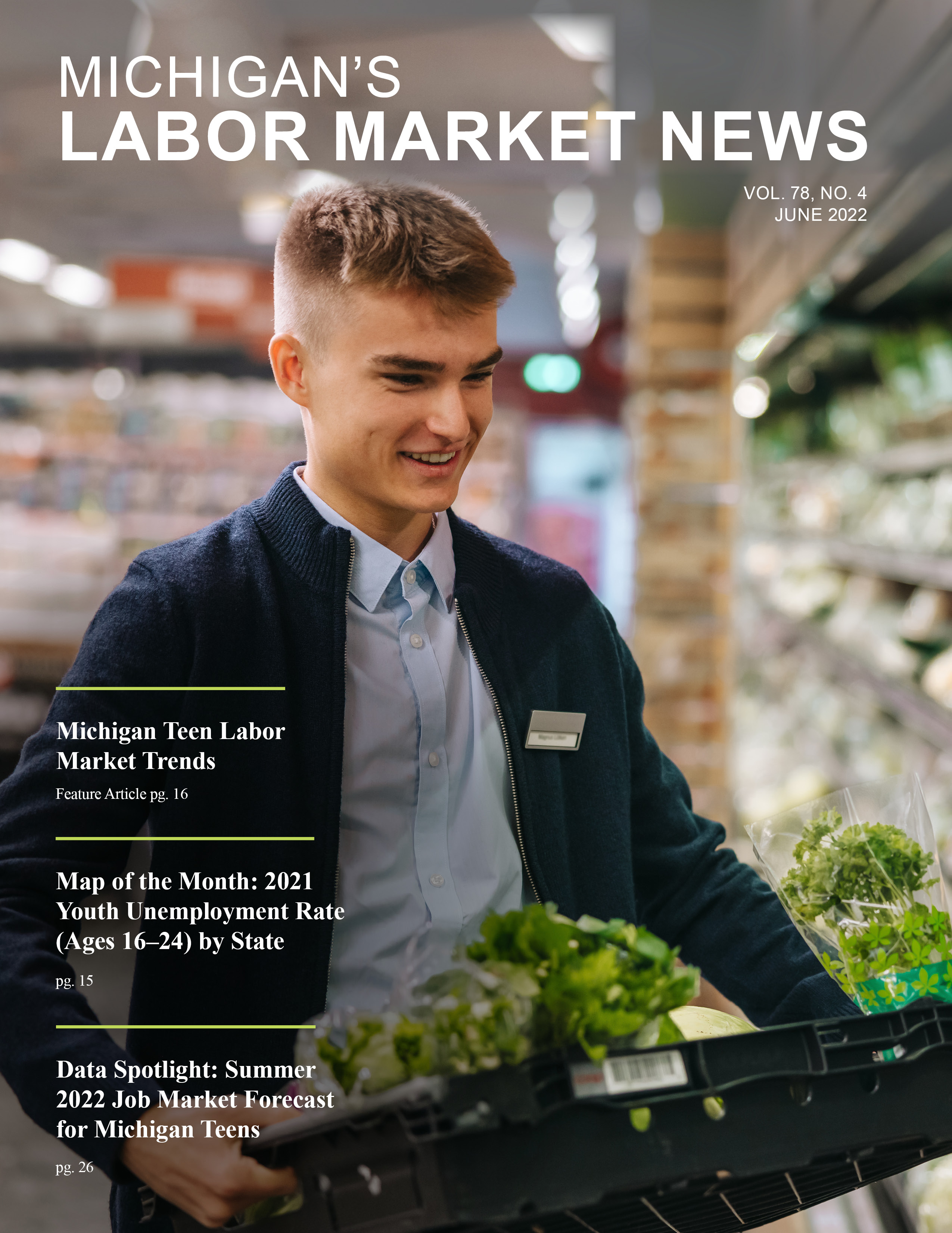 June 2022This month's issue features an article on the Michigan teen labor market trends, a Map of the Month that illustrates the 2021 youth unemployment rate (ages 16–24) by state, and a Data Spotlight that highlights the Summer 2022 Job Market Forecast for Michigan Teens.