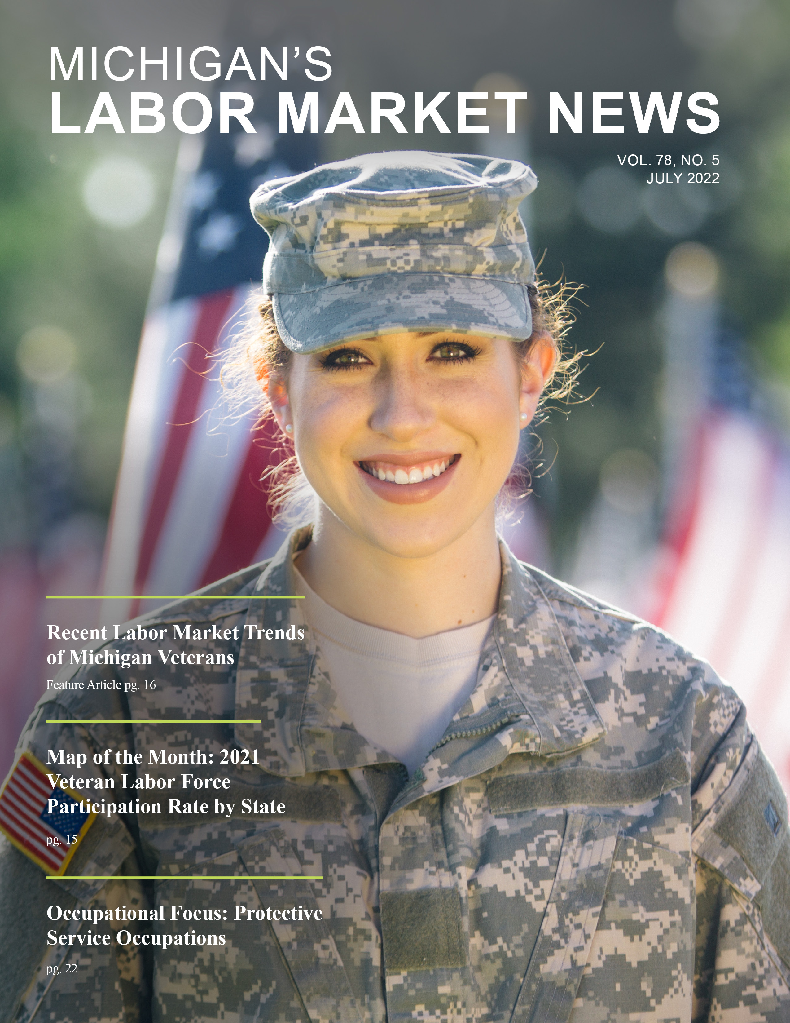 July 2022This month's issue features an article on recent labor market trends of Michigan veterans, a Map of the Month that illustrates the 2021 veteran labor force participation rate by state, and an Occupational Focus that highlights Protective service occupations.