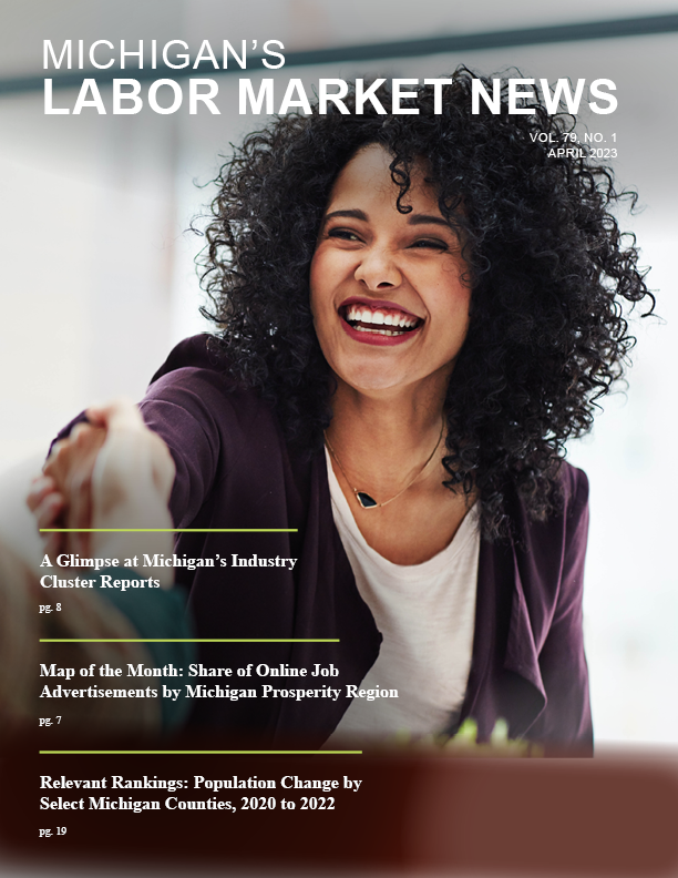 April 2023This month's issue features selections from the newly released Michigan Industry Cluster Workforce Analysis Reports, a map displaying the share of online job advertisements by Michigan prosperity region, a ranking of the population change in select counties, and more.
