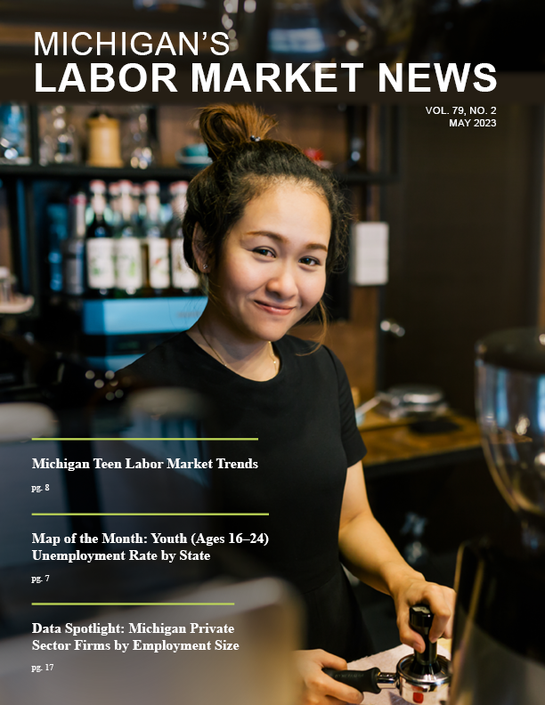 May 2023This month's issue highlights labor market trends for Michigan teens, a map displaying the youth unemployment rate by state, and a Data Spotlight on the state's private sector firms by employment size.