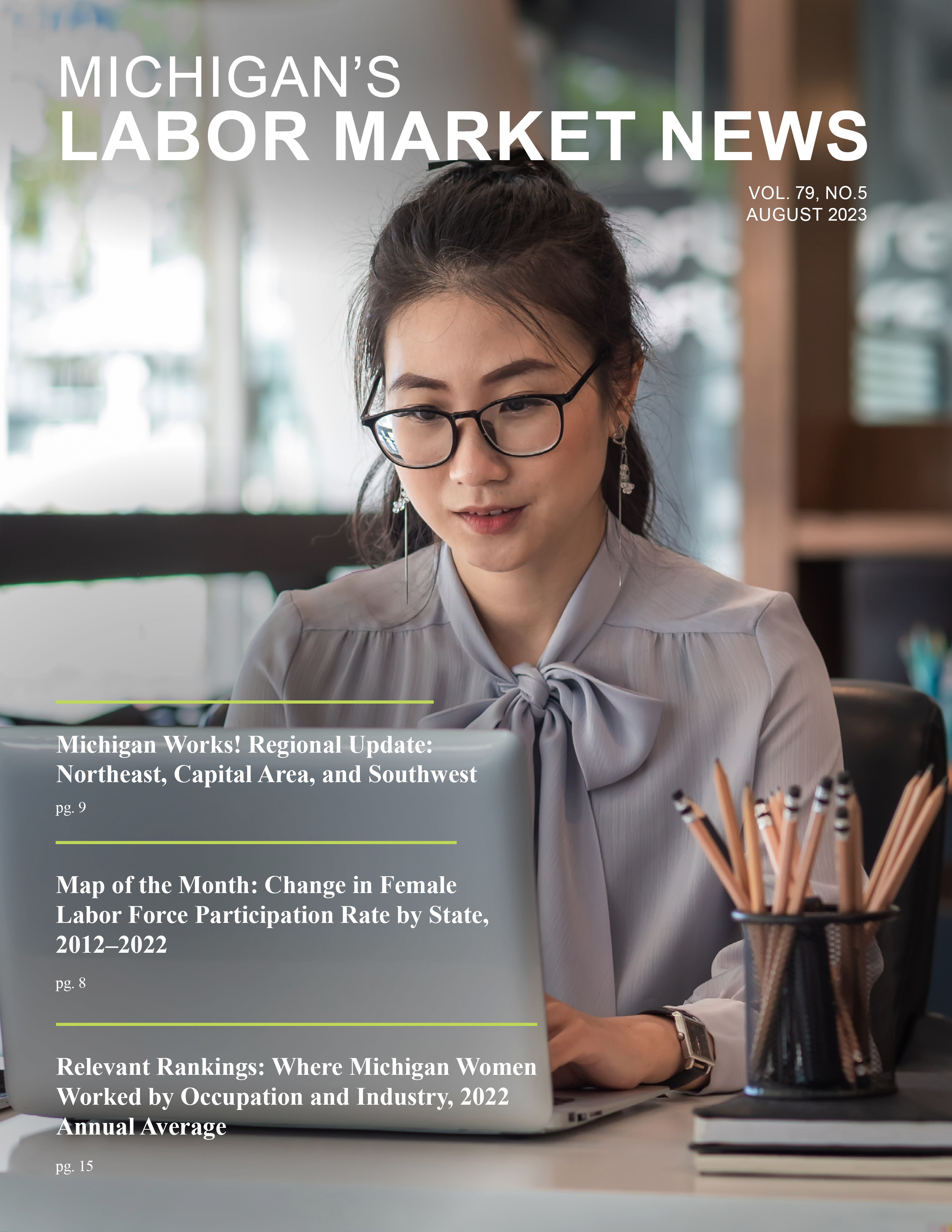 August 2023This month's issue features a labor market update on the Northwest and Oakland County Michigan Works! regions, a map displaying the change in female labor force participation rate by state, and the latest labor force and industry information for Michigan.