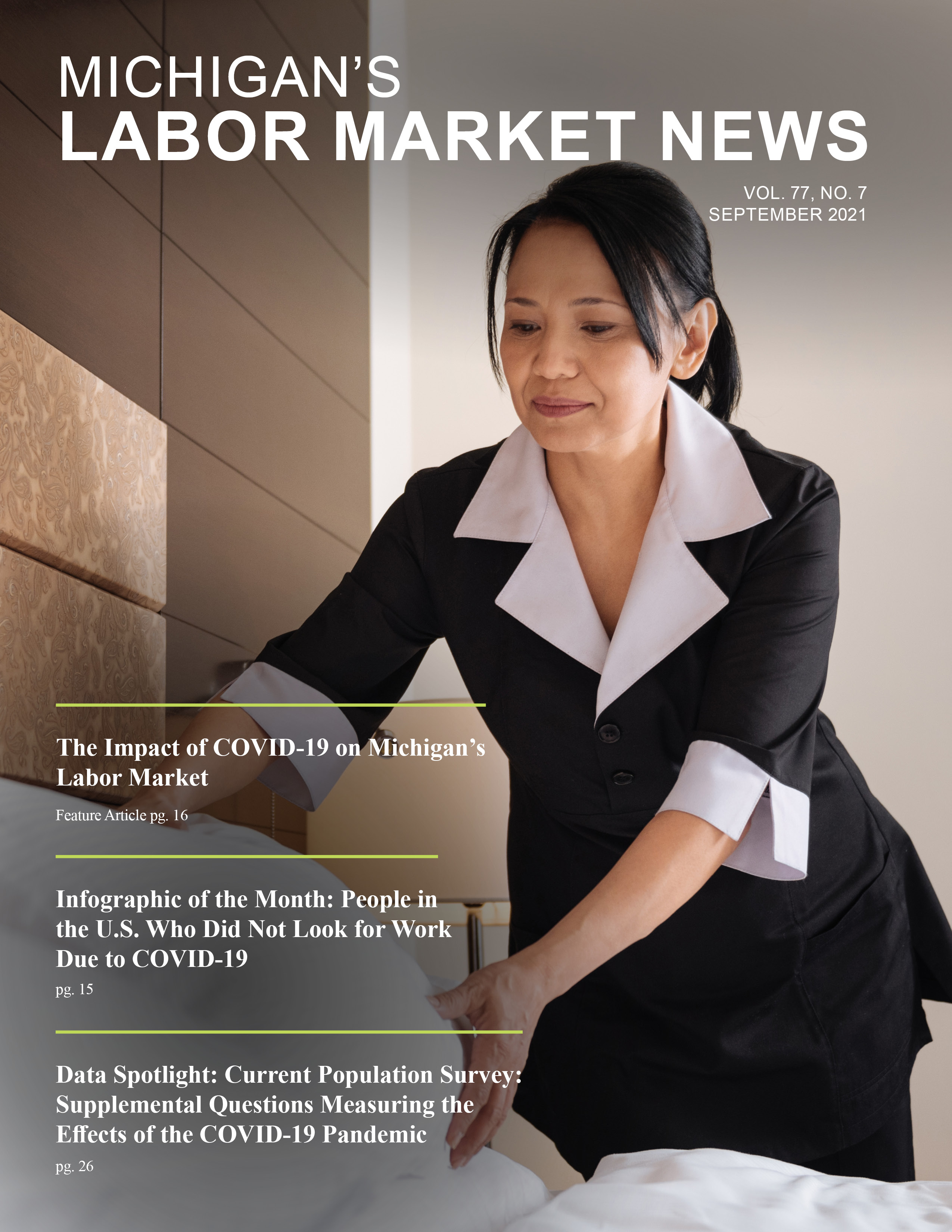 September 2021This month's issue features an article on The Impact of COVID-19 on Michigan’s Labor Market, and the Data Spotlight and Infographic of the Month both review responses to the Current Population Survey supplemental questions that ask how the pandemic has affected an individual’s ability to work.